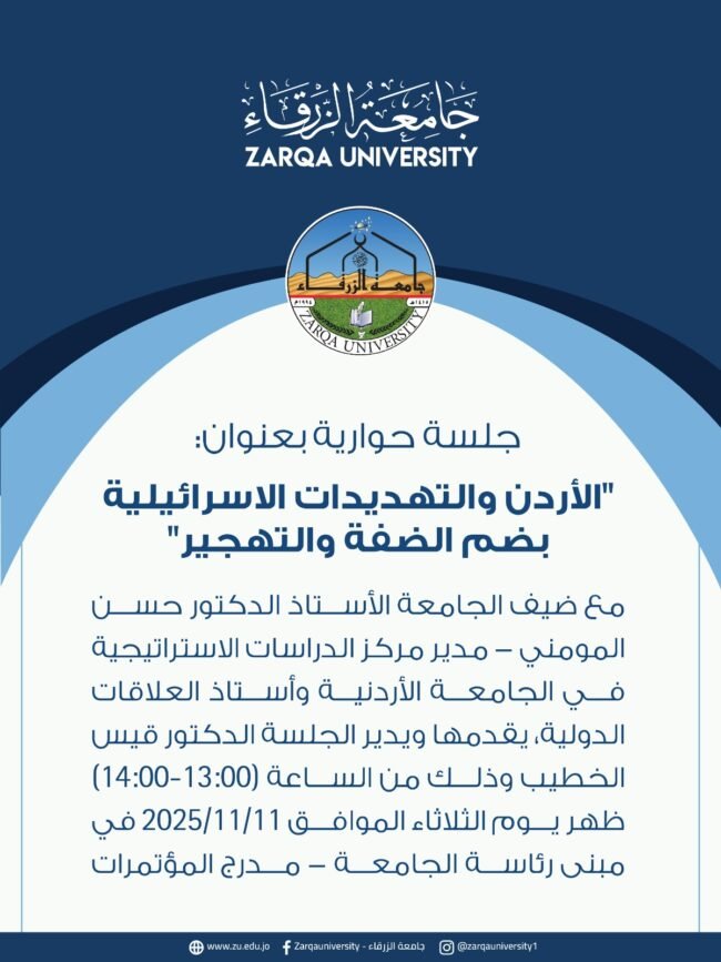 شارك الأستاذ الدكتور حسن المومني، مدير مركز الدراسات الاستراتيجية في الجامعة الأردنية في جلسة حوارية بعنوان “الأردن والتهديدات الإسرائيلية بضمّ الضفة والتهجير”، نظّمتها كلية الآداب في جامعة الزرقاء يوم الثلاثاء الموافق 11 تشرين الثاني 2025، وأدار الجلسة الدكتور قيس الخطيب.وشهدت الجلسة حضور رئيس الجامعة بالوكالة الأستاذ الدكتور علاء الدين صادق، وعميد كلية الآداب الأستاذ الدكتور…